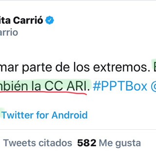 También luego de sus declaraciones en el programa de Jorge Lanata emitido hace apenas unas horas (y solo cuatro días después) afirmó en Twitter: “No quiero formar parte de los extremos. Estoy alejada de los extremos, también la CC ARI. #PPTBox @eltreceoficial”